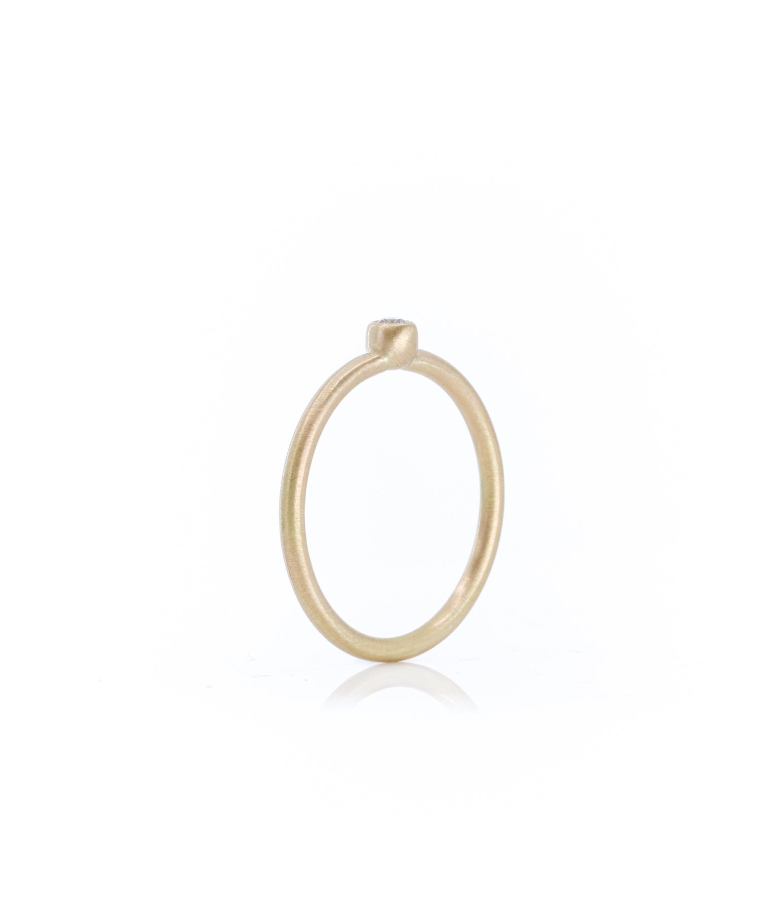 Minimalistischer Ring aus 585 Gelbgold mit einem weißen Saphir. Durch die spezielle Art der Einfassung ist der Stein von allen Seiten sichtbar und bekommt maximale Präsenz.