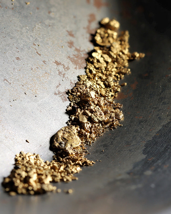 Faires Gold wird, bevor es in der Schweiz sortenrein raffiniert wird, hauptsächlich aus einer Mine in Peru bezogen, die bei gleichen Produktionsprozessen für das Fairtradesystem und den industriellen Weltmarkt konventionell produziert. Das finnische Waschgold hingegen wird von einem kleinen Zusammenschluss von Familienbetrieben sauber gewonnen. Die Umweltauflagen gehören zu den schärfsten der Welt (Hier haben Rentiere ein Recht auf klares Wasser!) Mit Feingoldgehalten bis zu 986/ooo und sonst nur Silber und Kupfer aus Recyclingmaterial lässt sich das rohe Gold direkt zur Schmucklegierung verarbeiten, ohne den üblichen Scheideprozess. Die Metalle haben eine klare Identität, denn es lässt sich exakt nachverfolgen, wer eine Charge geschürft hat und auf welchem Claim.